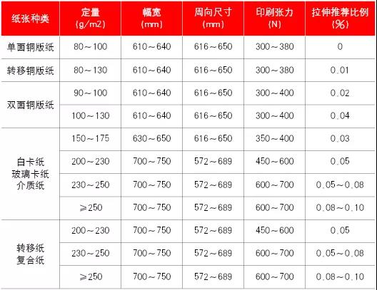 通過對(duì)我公司多年煙包生產(chǎn)經(jīng)驗(yàn)的總結(jié),分析出不同煙包常用紙張?jiān)诓煌鶎?、不同定量時(shí),通過對(duì)凹印制版文件的縱向拉伸,讓印刷張力既能滿足凹印自身套準(zhǔn)需求,又能保證印刷后產(chǎn)品周向尺寸滿足后道工序生產(chǎn)要求。煙包印刷紙張定量一般為80~250g/m2,凹版周向尺寸設(shè)計(jì)一般為572~689mm。凹印制版文件拉伸尺寸和紙張定量關(guān)系如表1所示。