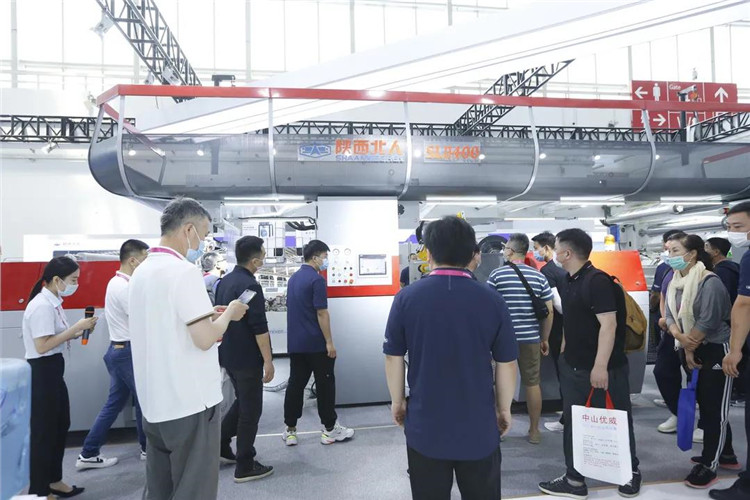 參展觀眾觀看北人智能子公司陜西北人SLⅡ400雙工位無溶劑復(fù)合機(jī)產(chǎn)品演示