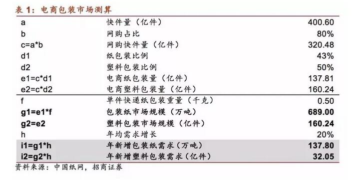 據(jù)統(tǒng)計(jì),快遞業(yè)務(wù)總量中約80%為網(wǎng)購(gòu)快件,其中43%使用紙質(zhì)包裝箱,假設(shè)單件快遞平均重量為0.5kg,則對(duì)應(yīng)包裝紙市場(chǎng)規(guī)模為689萬(wàn)噸,塑料包裝市場(chǎng)規(guī)模160.24億件。按照年均電商快遞量增長(zhǎng)20%計(jì)算,年新增包裝紙需求137.8萬(wàn)噸,新增塑料包裝需求32.05億件。