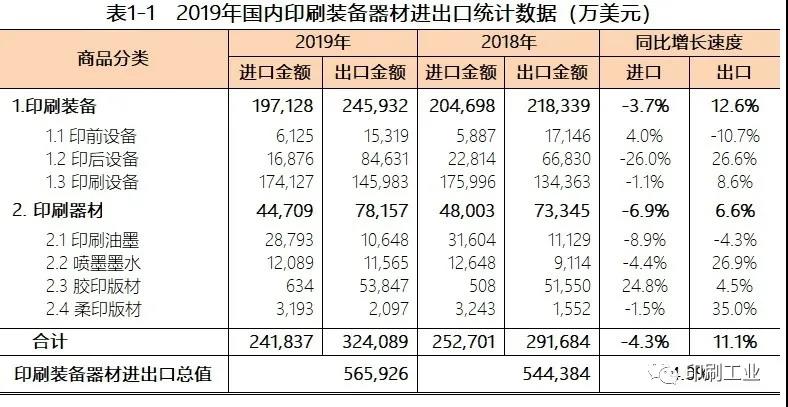 2019年是國內(nèi)外經(jīng)濟(jì)環(huán)境發(fā)生深刻變化的一年。世界主要大國經(jīng)濟(jì)增長動(dòng)能不足、逆全球化貿(mào)易保護(hù)勢(shì)頭加強(qiáng)、地緣政治矛盾激化;國內(nèi)產(chǎn)能和流動(dòng)性過剩、有效需求不足、宏觀經(jīng)濟(jì)運(yùn)行下行壓力加大,對(duì)企業(yè)的生產(chǎn)經(jīng)營、市場(chǎng)預(yù)期帶來很多不利影響。面對(duì)國內(nèi)外如此復(fù)雜局面,國內(nèi)印刷裝備、器材進(jìn)出口貿(mào)易能夠保持增長、貿(mào)易順差繼續(xù)擴(kuò)大,貿(mào)易商品結(jié)構(gòu)不斷優(yōu)化,展現(xiàn)出國內(nèi)印刷設(shè)備、器材制造業(yè)強(qiáng)大的發(fā)展韌性。2019年國內(nèi)印刷裝備、器材進(jìn)出口貿(mào)易概述2019年國內(nèi)印刷裝、器材進(jìn)出口貿(mào)易總值達(dá)到56.59億美元(同比增長4.0%),其中,進(jìn)口24.18億美元,同比下降4.3%;出口32.41億美元,同比增長11.1%。2019年國內(nèi)印刷裝備、器材進(jìn)出口貿(mào)易順差8.23億美元,同比增長111.0%。2019年國內(nèi)印刷裝備、器材進(jìn)口24.18億美元。其中,2019年國內(nèi)印刷裝備進(jìn)口19.71億美元,相比下降4.3%;國內(nèi)印刷器材進(jìn)口4.47億美元,同比下降6.9%。
