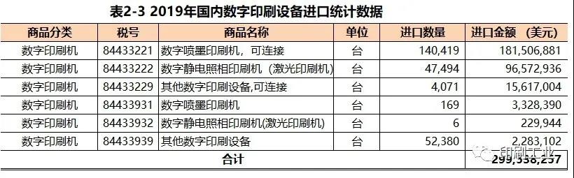 2019年,國內(nèi)進(jìn)口的四色及其他平張膠印機(jī)的主要來自德國和日本。數(shù)字印刷設(shè)備進(jìn)口2019年國內(nèi)各類數(shù)字印刷設(shè)備進(jìn)口接近3.00億美元、數(shù)量達(dá)24.45萬臺(tái)(參見 表2-3)。這些設(shè)備歸類在6個(gè)稅目下,除了業(yè)界通稱的數(shù)碼印刷機(jī)、噴墨印刷機(jī)外,還包括數(shù)字標(biāo)簽印刷機(jī)、大幅面噴墨印刷機(jī)等專業(yè)數(shù)字印刷設(shè)備。