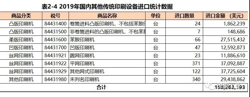 2019年國內(nèi)進(jìn)口各類噴墨印刷機(jī)14萬臺(tái)(與上年相比減少了12%)、平均進(jìn)口單價(jià)1315美元(與上年相比減少了13%);進(jìn)口各類激光數(shù)碼印刷機(jī)4.75萬臺(tái)(與上年相比增加了7%)、平均進(jìn)口單價(jià)2038美元(與上年相比增長了16%)。2019年國內(nèi)共進(jìn)口單價(jià)超過10萬美元的噴墨印刷設(shè)備190臺(tái),其主要進(jìn)口來源國為,瑞士、奧地利、以色列、意大利、西班牙、法國。需要說明的是,海關(guān)的6個(gè)相關(guān)稅目把數(shù)字印刷設(shè)備又分成了兩類,既與網(wǎng)絡(luò)和數(shù)據(jù)庫相關(guān)聯(lián)的設(shè)備和獨(dú)立使用的數(shù)字印刷設(shè)備。其目的是將用于不同領(lǐng)域的數(shù)字印刷設(shè)備區(qū)別開來。但在實(shí)踐中并不理想。這不僅是因?yàn)檫M(jìn)口歸類的人為因素的影響,也是由于數(shù)字印刷設(shè)備類型很多(數(shù)碼印刷機(jī)、數(shù)字標(biāo)簽印刷機(jī)、寬幅噴繪機(jī)、數(shù)字繪圖機(jī)等)。故當(dāng)印刷人看到數(shù)字印刷機(jī)的進(jìn)出口數(shù)據(jù)時(shí),常常感到困惑。對(duì)于想了解數(shù)字印刷設(shè)備在傳統(tǒng)印刷領(lǐng)域的增長信息的人士,還需要借鑒其他渠道的信息得出自己的判斷;但是對(duì)于印刷設(shè)備制造企業(yè)或?qū)﹃P(guān)心數(shù)字印刷應(yīng)用的人士而言,海關(guān)的數(shù)字印刷機(jī)進(jìn)口數(shù)據(jù)告訴了我們一個(gè)事實(shí),即目前國內(nèi)數(shù)字印刷機(jī)的主要應(yīng)用領(lǐng)域并不在傳統(tǒng)印刷行業(yè)。數(shù)字印刷技術(shù)、特別是噴墨印刷技術(shù)的發(fā)展遠(yuǎn)遠(yuǎn)突破了傳統(tǒng)意義上的“印刷機(jī)”,它的應(yīng)用領(lǐng)域也遠(yuǎn)遠(yuǎn)超出了我們所熟悉的“印刷行業(yè)”。其他常規(guī)印刷機(jī)進(jìn)口2019年國內(nèi)其他常規(guī)印刷機(jī)進(jìn)口1.58億美元(參見表2-4)、數(shù)量達(dá)1000臺(tái)。其中,凸印機(jī)進(jìn)口201萬美元(31臺(tái))、柔印機(jī)進(jìn)口2751萬美元(66臺(tái))、凹印機(jī)進(jìn)口1259萬美元(47臺(tái))、圓網(wǎng)印刷機(jī)進(jìn)口1189萬美元(23臺(tái))、平網(wǎng)印刷機(jī)進(jìn)口3709萬美元(371臺(tái))、其他網(wǎng)式印刷機(jī)進(jìn)口3773萬美元(122臺(tái))、未列明印刷機(jī)進(jìn)口2944萬美元(340臺(tái))。按設(shè)備進(jìn)口金額計(jì),占其他常規(guī)印刷機(jī)進(jìn)口值前三位的是其他網(wǎng)式印刷機(jī)(24%)、平網(wǎng)印刷機(jī)(23%)和未列明印刷機(jī)(19%)。