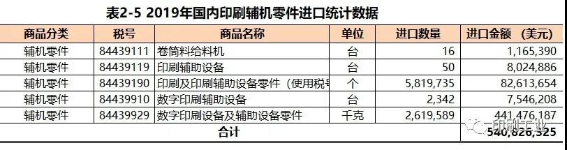 與2018年相比,2019年國內(nèi)柔版印刷機(jī)進(jìn)口數(shù)量增長了7%(由上年的62臺(tái)增長到66臺(tái))、其平均進(jìn)口單價(jià)下降了28%(由上年的57.93萬美元下降到41.69萬美元);凹印機(jī)進(jìn)口數(shù)量下降了18%(由上年的57臺(tái)減少到47臺(tái))、其平均進(jìn)口單價(jià)下降了19%(由上年的33.24萬美元下降到26.79萬美元);圓網(wǎng)印刷機(jī)進(jìn)口數(shù)量增長了1.5倍(由上年的9臺(tái)提高到23臺(tái))、平均進(jìn)口單價(jià)增長了15%(由上年的45.11萬美元提高到51.68萬美元);平網(wǎng)印刷機(jī)進(jìn)口數(shù)量下降了10%(由上年的414臺(tái)增加到371臺(tái))、平均進(jìn)口單價(jià)下降了21%(由上年的12.64萬美元下降到10.00萬美元)。按進(jìn)口單價(jià)超過100萬美元作為標(biāo)準(zhǔn),2019年國內(nèi)共進(jìn)口柔版印刷機(jī)13臺(tái)(進(jìn)口來源國有西班牙、捷克、德國、美國)、凹印機(jī)8臺(tái)(進(jìn)口來源國為意大利和日本)、圓網(wǎng)印刷機(jī)4臺(tái)(進(jìn)口來源國德國)。輔機(jī)零件進(jìn)口2019年進(jìn)口的輔機(jī)零件5.41億美元(參見 表2-5)。其中,涉及常規(guī)印刷機(jī)使用的部分占輔機(jī)零件進(jìn)口值的17%,數(shù)字印刷機(jī)使用的輔機(jī)零件占輔機(jī)零件進(jìn)口值的83%。本期,常規(guī)印刷機(jī)及輔機(jī)用零件進(jìn)口值8261萬美元(比上年增長了13%)、數(shù)字印刷設(shè)備及輔機(jī)用零件進(jìn)口4.41億美元(比上年下降了3%)。2019年國內(nèi)常規(guī)印刷機(jī)及輔機(jī)用零件進(jìn)口主要來源國是德國、日本、意大利、瑞士和荷蘭;數(shù)字印刷設(shè)備及輔機(jī)用零件進(jìn)口主要來源國日本、美國、新加坡、馬來西亞。