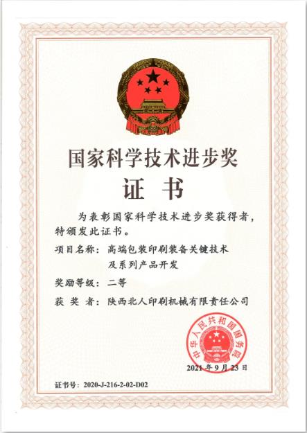 北人智能公司黨委副書記、總經(jīng)理李彥鋒,總工程師薛志成作為主要完成人參與完成的“高端包裝印刷裝備關(guān)鍵技術(shù)及系列產(chǎn)品開發(fā)”項目,獲國家科學技術(shù)進步獎二等獎!