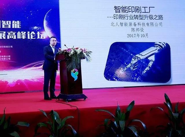 2017年10月18日,2017江蘇印刷業(yè)創(chuàng)新發(fā)展博覽會和印刷業(yè)創(chuàng)新發(fā)展高峰論壇在蘇州國際博覽中心舉行,北人智能裝備科技有限公司董事長陳邦設(shè)作為特邀嘉賓,在本次論壇上發(fā)表了《智能印刷工廠---印企轉(zhuǎn)型升級路》的主題演講。