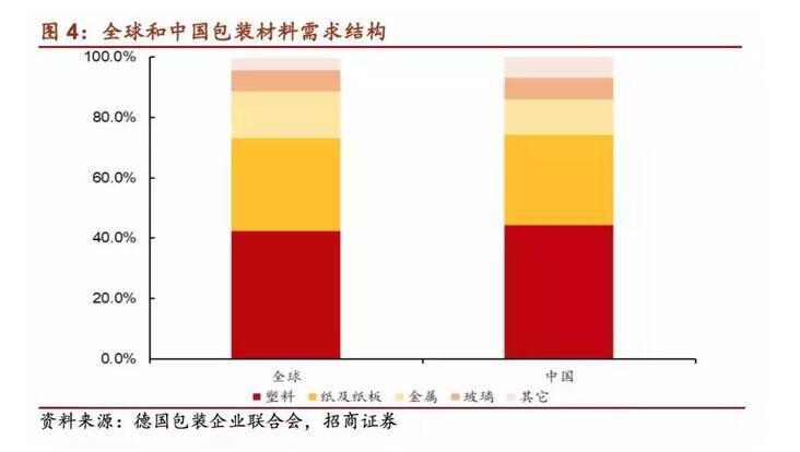 2. 展示銷(xiāo)售包裝的下游需求以消費(fèi)品為主,中國(guó)煙草包裝占比高,是國(guó)內(nèi)外消費(fèi)品包裝需要結(jié)構(gòu)的主要差異。食品飲料的包裝在全球和中國(guó)都是消費(fèi)品包裝中較重要的部分。