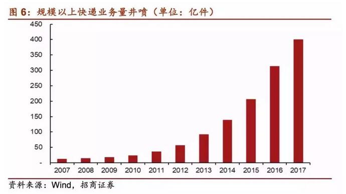 線上交易的商品離不開(kāi)線下的快遞和物流配送,國(guó)內(nèi)發(fā)達(dá)的物流體系也為逐年提高的電商滲透率提供了強(qiáng)大支撐。2011年以來(lái)我國(guó)規(guī)模以上快遞業(yè)務(wù)量出現(xiàn)“井噴式增長(zhǎng)”。2010年我國(guó)規(guī)模以上快遞業(yè)務(wù)量為23.39億件,到2017年增長(zhǎng)至400.6億件,復(fù)合年均增速超過(guò)50%。