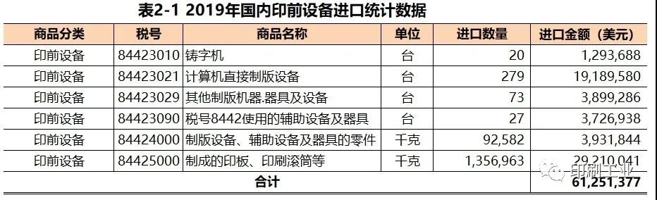 2019年國內(nèi)印刷裝備、器材進(jìn)口商品構(gòu)成2019年國內(nèi)印刷裝備、器材進(jìn)口總值24.18億美元。其中,印刷裝備進(jìn)口19.71億美元、印刷器材進(jìn)口4.47億美元。印刷裝備和印刷器材進(jìn)口占國內(nèi)印刷裝備、器材進(jìn)口總值的百分比分別為82%、18%。作為國內(nèi)印刷裝備、器材進(jìn)口貿(mào)易是主要組成部分,2019年印刷裝備進(jìn)口值中,印前設(shè)備0.61億美元、印刷設(shè)備18.41億美元、印后設(shè)備1.69億美元。三者占印刷裝備進(jìn)口值的百分比,分別為3%、88%和9%。1.印前設(shè)備進(jìn)口2019年國內(nèi)印前設(shè)備進(jìn)口6125萬美元(參見 表2-1)。其中,鑄字機(jī)進(jìn)口129萬美元(20臺(tái))、計(jì)算機(jī)直接制版機(jī)進(jìn)口1919萬美元(279臺(tái))、其他制版機(jī)390萬美元(73臺(tái))、制版輔助設(shè)備372萬美元(27臺(tái))、制版設(shè)備及輔助設(shè)備零件393萬美元、制成印版、滾筒及其他印刷部件進(jìn)口2921萬美元。計(jì)算機(jī)制版機(jī)和制成印版、滾筒及其他印刷部件是印前設(shè)備里進(jìn)口值大的兩項(xiàng)、占印前設(shè)備全年進(jìn)口值的79%。與2018年相比,2019年計(jì)算機(jī)直接制版機(jī)進(jìn)口數(shù)量增加了3%(由272臺(tái)提高到279臺(tái)),其平均進(jìn)口單價(jià)下降了11%(由7.75萬美元減低到6.88萬美元)。計(jì)算機(jī)直接制版機(jī)的主要進(jìn)口來源國是德國、日本、加拿大、比利時(shí)。