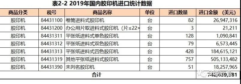 2.印刷設(shè)備進(jìn)口2019年國內(nèi)印刷設(shè)備進(jìn)口17.41億美元。其中,膠印機(jī)進(jìn)口7.43億美元、數(shù)字印刷機(jī)進(jìn)口3.00億美元、其他常規(guī)印刷機(jī)(凹印機(jī)、凸印機(jī)、絲印機(jī)、柔印機(jī)、未列明印刷機(jī))進(jìn)口1.58億美元、輔機(jī)零件進(jìn)口5.41億美元。膠印機(jī)、數(shù)字印刷機(jī)、其他常規(guī)印刷機(jī)、輔機(jī)零件進(jìn)口占印刷設(shè)備進(jìn)口值的百分比分別為43%、17%、9%、31%。膠印機(jī)進(jìn)口2019年國內(nèi)膠印機(jī)進(jìn)口7.43億美元(1528臺(tái))。其中,卷筒膠印機(jī)進(jìn)口2695萬美元(82臺(tái))、平張紙單色膠印機(jī)進(jìn)口109萬美元(128臺(tái))、平張紙雙色膠印機(jī)進(jìn)口657萬美元(79臺(tái))、平張四色膠印機(jī)1.84億美元(428臺(tái))、其他平張(四色以上)膠印機(jī)進(jìn)口5.05億美元(757臺(tái))。進(jìn)口值大的平張四色膠印機(jī)和其他平張(四色以上)膠印機(jī)進(jìn)口占膠印機(jī)進(jìn)口總值的93%(參見 表2-2)。